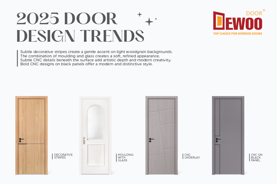 Discover the 2025 trend-setting collection of DEWOO Door composite wood-plastic doors – the top choice for modern living spaces. Featuring elegant designs and a wide variety of styles, from classic to minimalist, these doors are crafted from premium composite wood-plastic materials. They offer long-lasting durability, excellent moisture resistance, warp resistance, and effortless maintenance. DEWOO Door’s composite doors promise to be a striking highlight in any interior project, aligning perfectly with the aesthetic and functional trends of 2025.