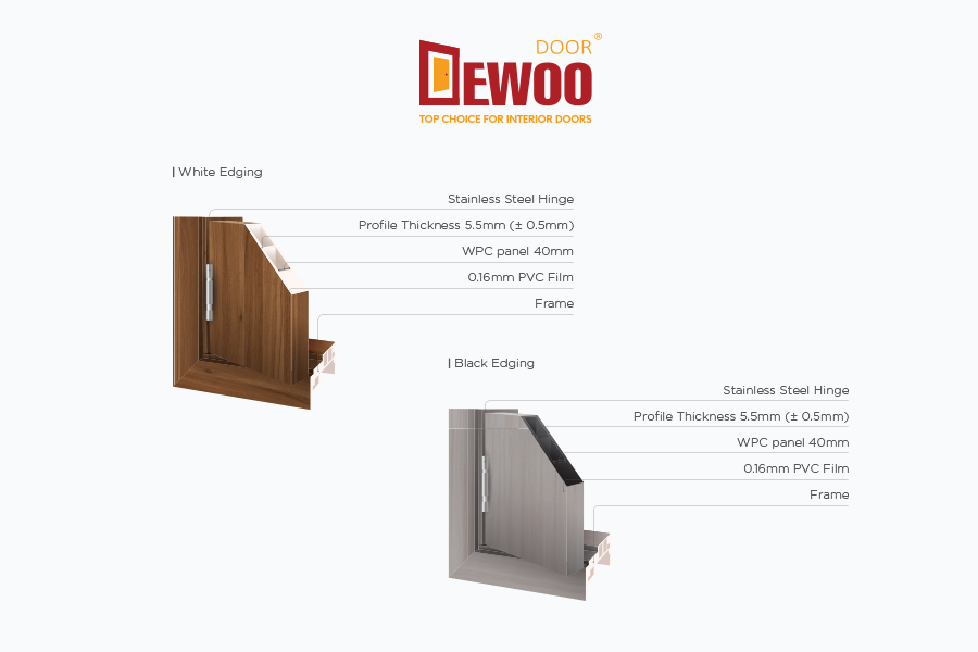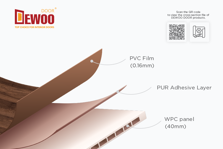 • WPC Core (Wood-Plastic Composite): Extruded using DEWOO Door’s proprietary advanced manufacturing technology.